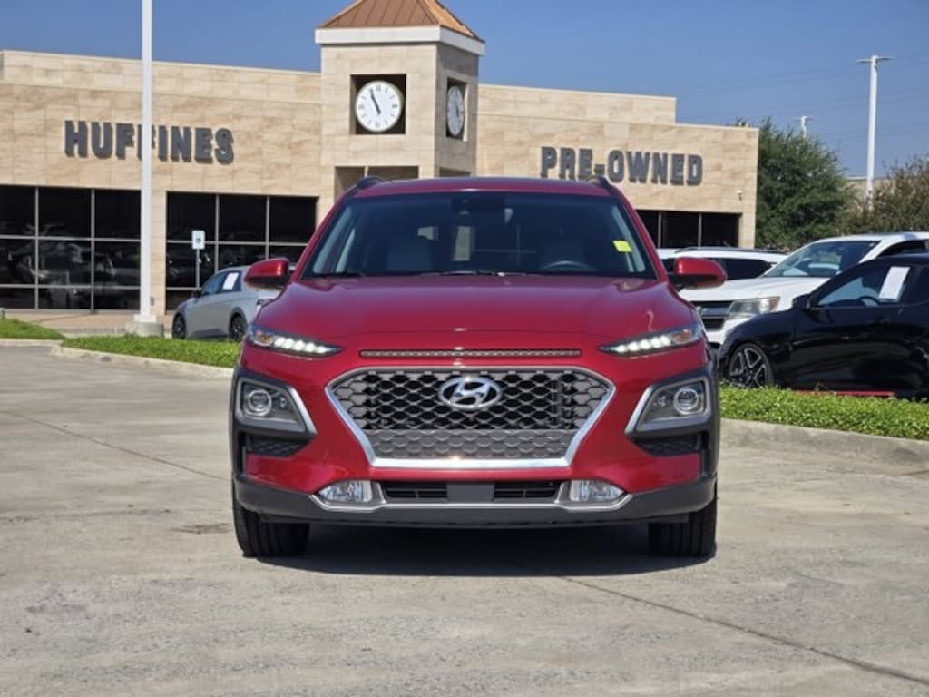Option Group 01, Kona Ultimate, 4D Sport Utility, I4, 7-Speed Automatic, FWD, Pulse Red, Black w/Leather Seat Trim, ABS brakes, Apple CarPlay & Android Auto, Auto-dimming Rear-View mirror, Exterior Parking Camera Rear, Front anti-roll bar, Front fog lights, Garage door transmitter: HomeLink, Heads-Up Display, Heated door mirrors, Heated Front Bucket Seats, Heated front seats, Leather Seat Trim, Navigation System, Overhead airbag, Power moonroof, Radio: AM/FM/MP3/HD Radio/SiriusXM Audio System, Remote keyless entry, Security system, Steering wheel mounted audio controls, Wheels: 18 x 7.5J Alloy, 3.579 Axle Ratio, 4-Wheel Disc Brakes, 8 Speakers, Air Conditioning, Alloy wheels, AM/FM radio: SiriusXM, Auto High-beam Headlights, Automatic temperature control, Brake assist, Bumpers: body-color, Cargo Net, Carpeted Floor Mats, Delay-off headlights, Driver door bin, Driver vanity mirror, Dual front impact airbags, Dual front side impact airbags, Electronic Stability Control, Emergency communication system, Front Bucket Seats, Front Center Armrest, Front reading lights, Front wheel independent suspension, Fully automatic headlights, Illuminated entry, Leather Shift Knob, Leather steering wheel, Low tire pressure warning, Occupant sensing airbag, Outside temperature display, Overhead console, Panic alarm, Passenger door bin, Passenger vanity mirror, Power door mirrors, Power driver seat, Power steering, Power windows, Rain sensing wipers, Rear Bumper Applique, Rear seat center armrest, Rear window defroster, Rear window wiper, Roof rack: rails only, Speed control, Speed-sensing steering, Split folding rear seat, Spoiler, Tachometer, Telescoping steering wheel, Tilt steering wheel, Traction control, Trip computer, Turn signal indicator mirrors, and Variably intermittent wipers.