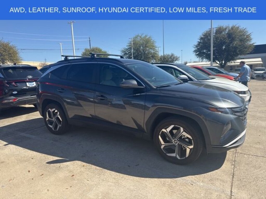Portofino Gray 2023 Hyundai Tucson SEL CONVENIENCE 2.5L I4 DGI DOHC 16V LEV3-ULEV70 187hp AWD 8-Speed Automatic with SHIFTRONIC **CLEAN CARFAX**, **LOCAL TRADE**, **MOONROOF**, **KEYLESS ENTRY**, **REMOTE START**, **LEATHER INTERIOR**, **REARVIEW CAMERA**, **BLUETOOTH / HANDS FREE CALLING**, **HYUNDAI CERTIFIED AT NO EXTRA CHARGE**, **ALL-WHEEL DRIVE**, **HEATED SEATS**, **APPLE CARPLAY AND ANDROID AUTO**, **POWER LIFTGATE**, 10.25" Digital Instrument Cluster, Auto-Dimming Interior Mirror w/Homelink, Convenience Package, Dual Automatic Temperature Control, H-Tex Seat Trim, Heated front seats, Leather-Wrapped Shift Knob, Leather-Wrapped Steering Wheel, LED Interior Lights (Room, Map), Option Group 02, Power driver seat, Power Liftgate, Power Sunroof, Radio: AM/FM/HD/SiriusXM Audio System, Remote keyless entry, Security system, Steering wheel mounted audio controls, Ultrasonic Rear Occupant Alert, Wheels: 19" x 7.5J" Machine-Face Finish Alloy.