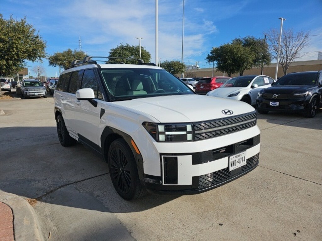 Serenity White 2025 Hyundai Santa Fe Hybrid Calligraphy I4 AWD 6-Speed Automatic with Shiftronic **CARFAX ONE OWNER**, **CLEAN CARFAX**, **LOCAL TRADE**, **NAVIGATION**, **MOONROOF**, **KEYLESS ENTRY**, **REMOTE START**, **LEATHER INTERIOR**, **REARVIEW CAMERA**, **BLUETOOTH / HANDS FREE CALLING**, **HYUNDAI CERTIFIED AT NO EXTRA CHARGE**, **ALL-WHEEL DRIVE**, **VENTILATED SEATS**, **FRONT AND REAR HEATED SEATS**, **HEATED STEERING WHEEL**, **HEADS-UP DISPLAY**, **PANORAMIC SUNROOF**, **APPLE CARPLAY AND ANDROID AUTO**, **POWER LIFTGATE**, **LOADED!!**, 3rd row seats: bench, ABS brakes, AM/FM radio: SiriusXM, Apple CarPlay & Android Auto, Auto-dimming Rear-View mirror, Exterior Parking Camera Rear, Front anti-roll bar, Garage door transmitter: HomeLink, Heads-Up Display, Heated & Ventilated Front Bucket Seats, Heated door mirrors, Heated front seats, Heated rear seats, Heated steering wheel, Knee airbag, Memory seat, Navigation System, Overhead airbag, Power driver seat, Power Liftgate, Power moonroof, Power passenger seat, Premium Nappa Leather Seat Trim, Radio: AM/FM/HD Bose Premium Audio System, Rear anti-roll bar, Rear side impact airbag, Remote keyless entry, Security system, Steering wheel mounted audio controls, Ventilated front seats, Wheels: 20" x 8.5J Unique Dark Finish Alloy.