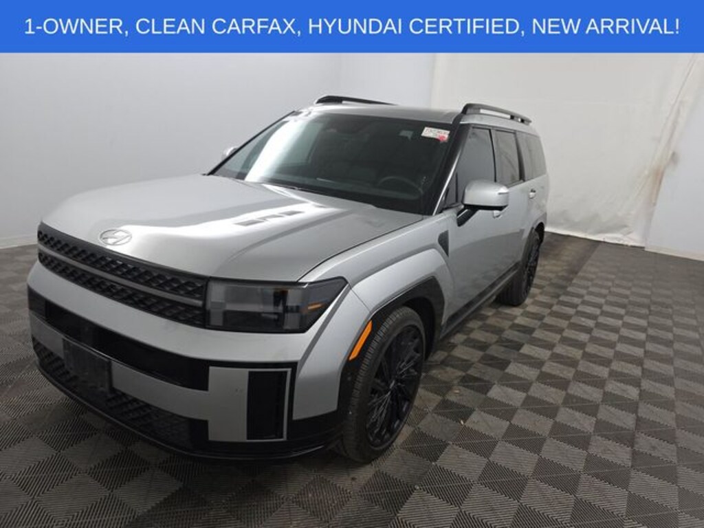 Shimmering Silver 2025 Hyundai Santa Fe Calligraphy 2.5L I4 AWD Shiftronic **CARFAX ONE OWNER**, **CLEAN CARFAX**, **NAVIGATION**, **MOONROOF**, **KEYLESS ENTRY**, **REMOTE START**, **LEATHER INTERIOR**, **REARVIEW CAMERA**, **BLUETOOTH / HANDS FREE CALLING**, **HYUNDAI CERTIFIED AT NO EXTRA CHARGE**, **ALL-WHEEL DRIVE**, **VENTILATED SEATS**, **FRONT AND REAR HEATED SEATS**, **HEATED STEERING WHEEL**, **HEADS-UP DISPLAY**, **PANORAMIC SUNROOF**, **APPLE CARPLAY AND ANDROID AUTO**, **POWER LIFTGATE**, **LOADED!!**, 3rd row seats: bench, ABS brakes, AM/FM radio: SiriusXM, Apple CarPlay & Android Auto, Auto-dimming Rear-View mirror, Exterior Parking Camera Rear, Front anti-roll bar, Garage door transmitter: HomeLink, Heads-Up Display, Heated & Ventilated Front Bucket Seats, Heated door mirrors, Heated front seats, Heated rear seats, Heated steering wheel, Knee airbag, Memory seat, Navigation System, Overhead airbag, Power driver seat, Power Liftgate, Power moonroof, Power passenger seat, Premium Nappa Leather Seat Trim, Radio: AM/FM/HD Bose Premium Audio System, Rear anti-roll bar, Rear side impact airbag, Remote keyless entry, Security system, Steering wheel mounted audio controls, Ventilated front seats, Wheels: 21" x 8.5J Unique Dark Finish Alloy.
