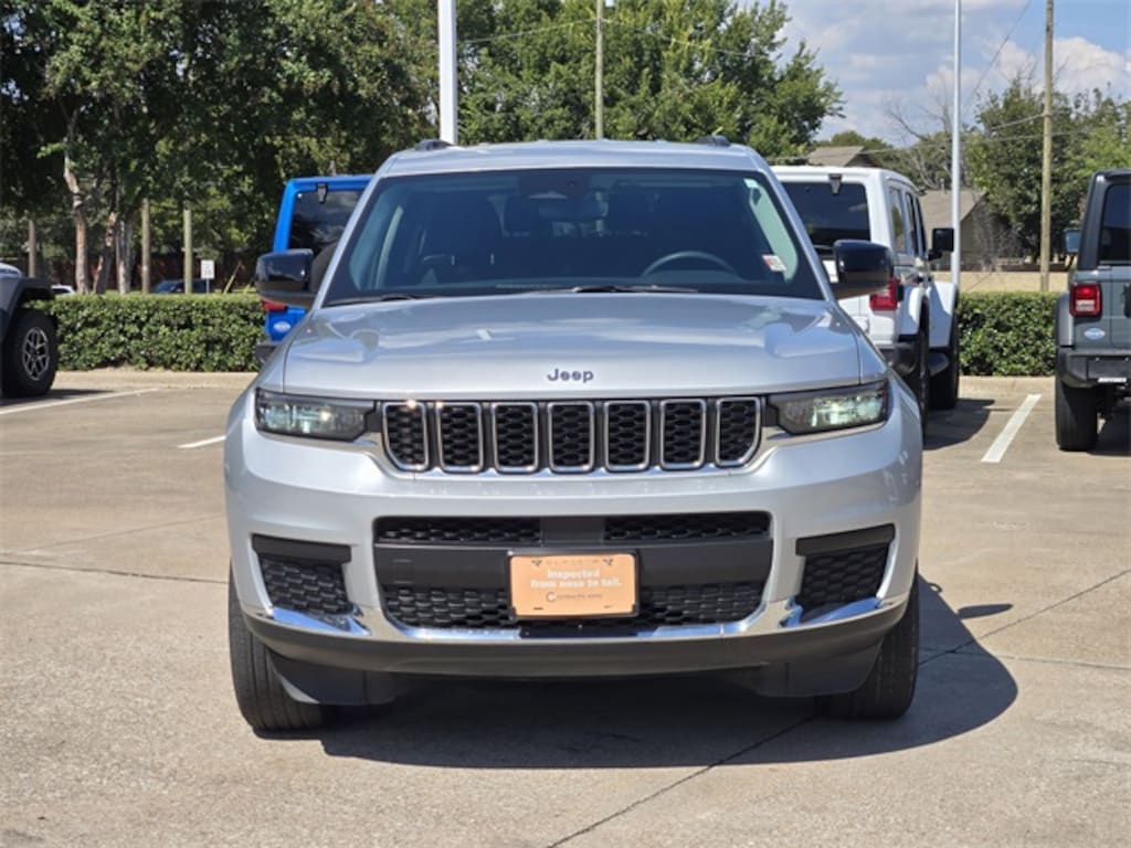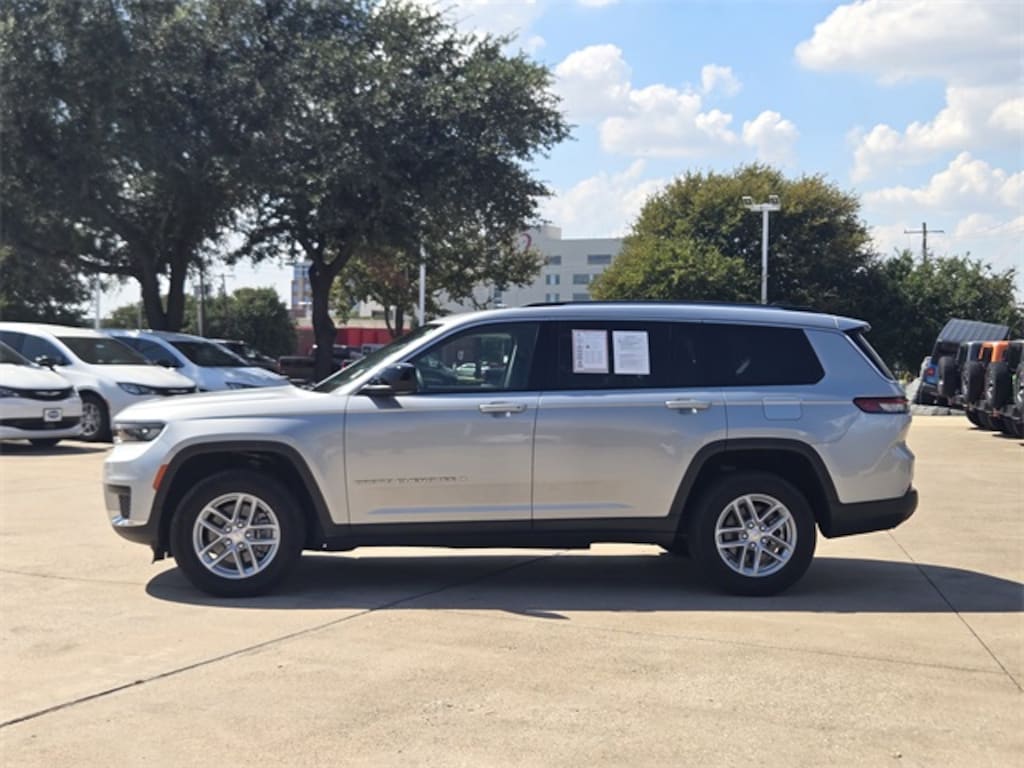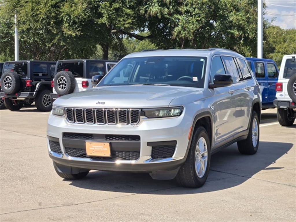 CARFAX One-Owner. Silver Zynith 2023 Jeep Grand Cherokee L Laredo Laredo 8-Speed Automatic 3.6L V6 24V VVT 4WD Quick Order Package 23A Laredo, 2nd Row 60/40 Bench w/Manual Tip/Slide, 2nd Row Seat Center Armrest/Cupholders, 3 Rear Seat Head Restraints, 3.45 Rear Axle Ratio, 3rd row seats: split-bench, 4-Wheel Disc Brakes, 6 Speakers, 7-Passenger Seating, ABS brakes, Air Conditioning, Alloy wheels, Anti-whiplash front head restraints, Automatic temperature control, Brake assist, Bumpers: body-color, Center Rear 3-Point Seat Belt, Cloth Seats, Compass, Delay-off headlights, Driver door bin, Driver vanity mirror, Dual front impact airbags, Dual front side impact airbags, Electronic Stability Control, Emergency communication system, Four wheel independent suspension, Front anti-roll bar, Front Bucket Seats, Front Center Armrest w/Storage, Front dual zone A/C, Front License Plate Bracket, Front reading lights, Fully automatic headlights, Heated door mirrors, Illuminated entry, Knee airbag, Low tire pressure warning, Manual Fold Seatbacks, Molded In Color Black/Gloss Black Roof Rails, Normal Duty Suspension, Occupant sensing airbag, Outside temperature display, Overhead airbag, Overhead console, Panic alarm, ParkView Rear Back-Up Camera, Passenger door bin, Passenger vanity mirror, Power door mirrors, Power driver seat, Power steering, Power windows, Radio data system, Radio: Uconnect 5 w/8.4" Display, Rear air conditioning, Rear anti-roll bar, Rear reading lights, Rear window defroster, Rear window wiper, Reclining 3rd row seat, Remote keyless entry, Security system, Speed control, Speed-Sensitive Wipers, Split folding rear seat, Spoiler, Steering wheel mounted audio controls, Tachometer, Telescoping steering wheel, Tilt steering wheel, Traction control, Trip computer, Variably intermittent wipers, Voltmeter, and Wheels: 18" x 8.0" Fully Painted Aluminum.