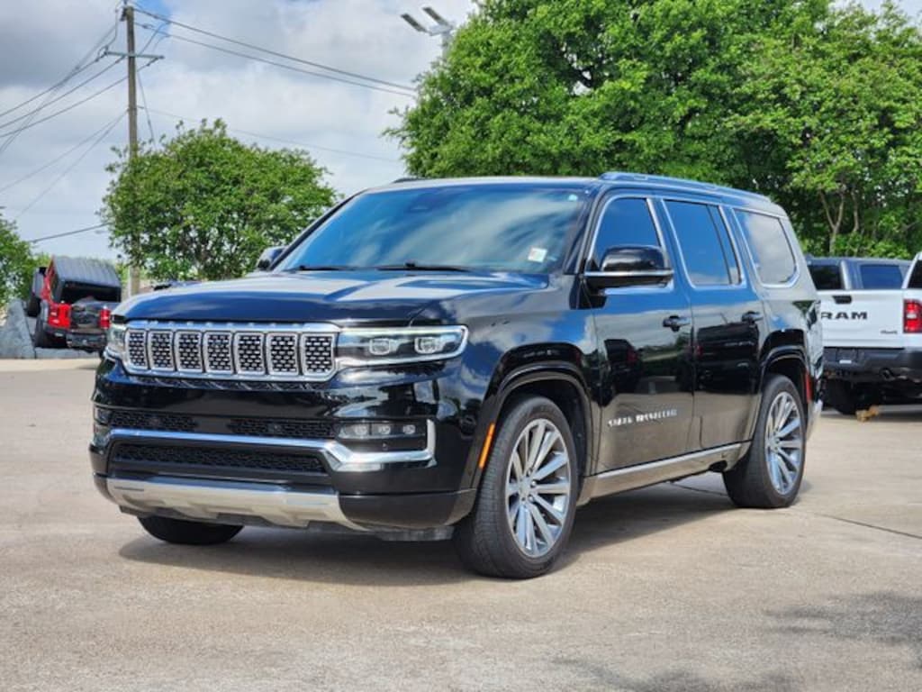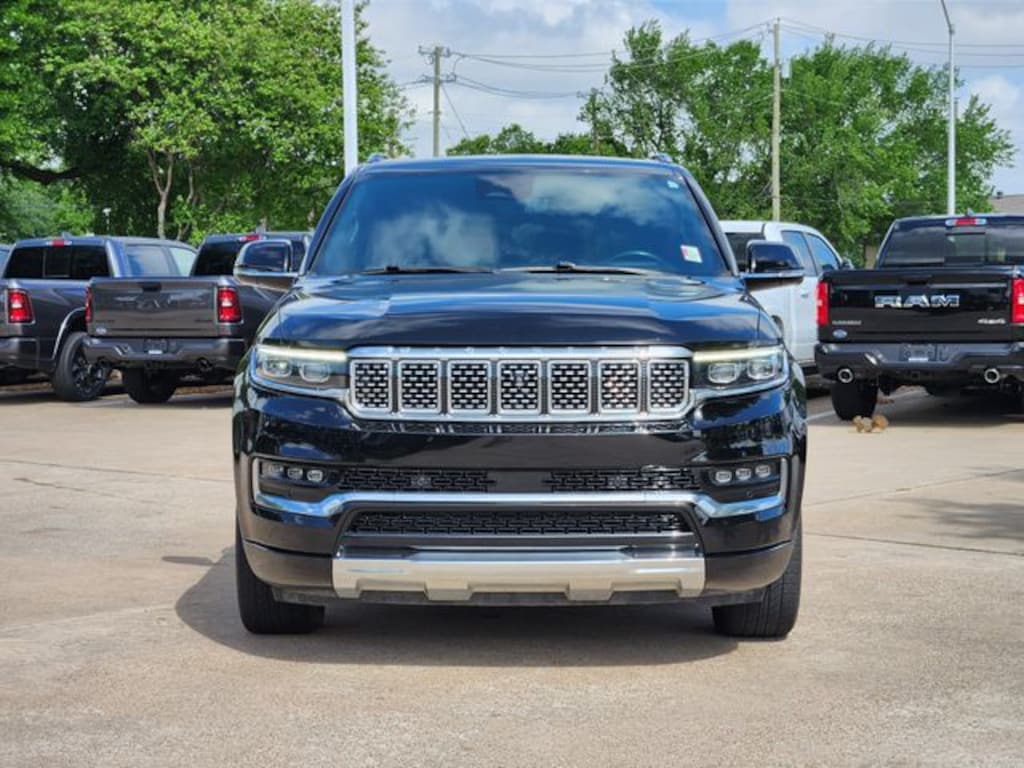 Certified. Clean CARFAX. Diamond Black Crystal Pearlcoat 2023 Jeep Grand Wagoneer Series II Series II 8-Speed Automatic 3.0L I6 4WD Quick Order Package 28S, Two Tone Paint Group, FCA US LLC Certified Pre-Owned Certified, 19 Speakers, 3.92 Rear Axle Ratio, 3rd row seats: bench, 4-Wheel Disc Brakes, ABS brakes, Adjustable pedals, Air Conditioning, Alloy wheels, AM/FM radio: SiriusXM with 360L, Anti-whiplash front head restraints, Audio memory, Auto High-beam Headlights, Auto-dimming door mirrors, Auto-dimming Rear-View mirror, Auto-leveling suspension, Automatic temperature control, Body Color Roof, Brake assist, Bumpers: body-color, Compass, Delay-off headlights, Driver door bin, Driver vanity mirror, Driver's Seat Mounted Armrest, Dual front impact airbags, Dual front side impact airbags, Electronic Stability Control, Emergency communication system: Automatic SOS Call, Four wheel independent suspension, Front anti-roll bar, Front Bucket Seats, Front Center Armrest w/Storage, Front dual zone A/C, Front fog lights, Front reading lights, Fully automatic headlights, Garage door transmitter, Genuine wood console insert, Genuine wood dashboard insert, Genuine wood door panel insert, Heads-Up Display, Heated door mirrors, Heated front seats, Heated rear seats, Heated steering wheel, Illuminated entry, Knee airbag, Leather steering wheel, Leather Trimmed Bucket Seats, Low tire pressure warning, Memory seat, Navigation System, Normal Duty Suspension, Occupant sensing airbag, Outside temperature display, Overhead airbag, Overhead console, Panic alarm, Passenger door bin, Passenger seat mounted armrest, Passenger vanity mirror, Pedal memory, Power adjustable front head restraints, Power door mirrors, Power driver seat, Power Liftgate, Power moonroof, Power passenger seat, Power steering, Power windows, Radio data system, Radio: Uconnect 5 Nav w/12.0" Display, Rain sensing wipers, Rear air conditioning, Rear anti-roll bar, Rear dual zone A/C, Rear reading lights, Rear seat center armrest, Rear window defroster, Rear window wiper, Reclining 3rd row seat, Remote keyless entry, Security system, Speed control, Speed-sensing steering, Speed-Sensitive Wipers, Split folding rear seat, Steering wheel memory, Steering wheel mounted audio controls, Tachometer, Telescoping steering wheel, Tilt steering wheel, Traction control, Trip computer, Turn signal indicator mirrors, Variably intermittent wipers, Ventilated front seats, Voltmeter, and Wheels: 22" x 9.0" Premium 1 Aluminum.
