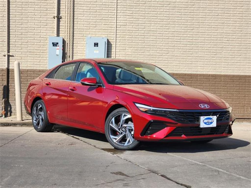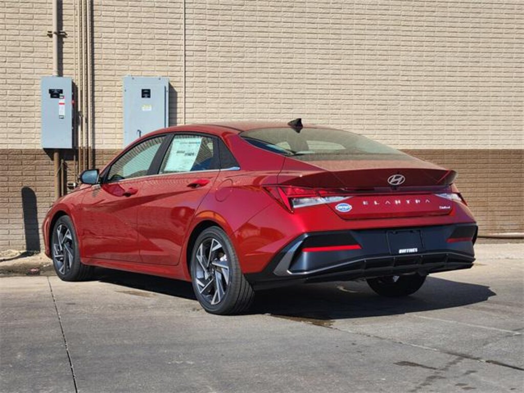 $750 off MSRP! New Price! Red 2025 Hyundai Elantra Limited 4D Sedan Limited FWD CVT I4 Option Group 01, 17" x 7.0J Alloy Wheels, 4-Wheel Disc Brakes, 8 Speakers, ABS brakes, Air Conditioning, Alloy wheels, AM/FM radio: SiriusXM, Apple CarPlay & Android Auto, Auto High-beam Headlights, Auto-dimming Rear-View mirror, Automatic temperature control, Brake assist, Bumpers: body-color, Delay-off headlights, Driver door bin, Driver vanity mirror, Dual front impact airbags, Dual front side impact airbags, Electronic Stability Control, Emergency communication system: Bluelink+, Front anti-roll bar, Front Bucket Seats, Front Center Armrest, Front dual zone A/C, Front reading lights, Front wheel independent suspension, Fully automatic headlights, H-Tex Leatherette Seats, Heated door mirrors, Heated Front Bucket Seats, Heated front seats, Illuminated entry, Leather steering wheel, Low tire pressure warning, Navigation System, Occupant sensing airbag, Outside temperature display, Overhead airbag, Overhead console, Panic alarm, Passenger door bin, Passenger vanity mirror, Power door mirrors, Power driver seat, Power moonroof, Power steering, Power windows, Radio: AM/FM/HD/SiriusXM Display Audio, Rear seat center armrest, Rear side impact airbag, Rear window defroster, Remote keyless entry, Security system, Speed control, Speed-sensing steering, Split folding rear seat, Steering wheel mounted audio controls, Tachometer, Telescoping steering wheel, Tilt steering wheel, Traction control, Trip computer, Turn signal indicator mirrors, and Variably intermittent wipers.