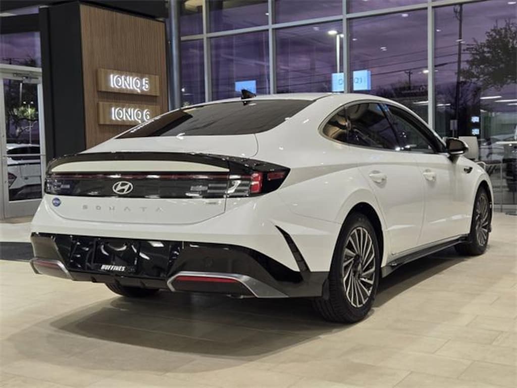 $2,750 off MSRP! White 2025 Hyundai Sonata Hybrid SEL 4D Sedan SEL FWD 6-Speed Automatic with Shiftronic I4 Option Group 01, 17" x 7.0J Aluminum Alloy Wheels, 4-Wheel Disc Brakes, 6 Speakers, ABS brakes, Air Conditioning, Alloy wheels, AM/FM radio: SiriusXM, Apple CarPlay & Android Auto, Auto High-beam Headlights, Automatic temperature control, Brake assist, Bumpers: body-color, Cargo Net, Cargo Tray, Carpeted Floor Mats, Cloth Seating Surfaces, Delay-off headlights, Driver door bin, Driver vanity mirror, Dual front impact airbags, Dual front side impact airbags, Electronic Stability Control, Emergency communication system: Bluelink+, First Aid Kit, Four wheel independent suspension, Front anti-roll bar, Front Bucket Seats, Front Center Armrest, Front dual zone A/C, Front reading lights, Fully automatic headlights, Heated door mirrors, Heated Front Bucket Seats, Heated front seats, Illuminated entry, Knee airbag, Lane Departure Warning System, Leather steering wheel, Low tire pressure warning, Mud Guards, Occupant sensing airbag, Outside temperature display, Overhead airbag, Overhead console, Panic alarm, Passenger door bin, Passenger vanity mirror, Power door mirrors, Power driver seat, Power passenger seat, Power steering, Power windows, Radio data system, Radio: AM/FM/HD/SiriusXM, Rear anti-roll bar, Rear seat center armrest, Rear side impact airbag, Rear window defroster, Remote keyless entry, Security system, Speed control, Speed-sensing steering, Speed-Sensitive Wipers, Split folding rear seat, Spoiler, Steering wheel mounted audio controls, Tachometer, Telescoping steering wheel, Tilt steering wheel, Traction control, Trip computer, Variably intermittent wipers, and Wheel Locks.