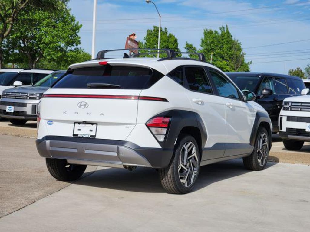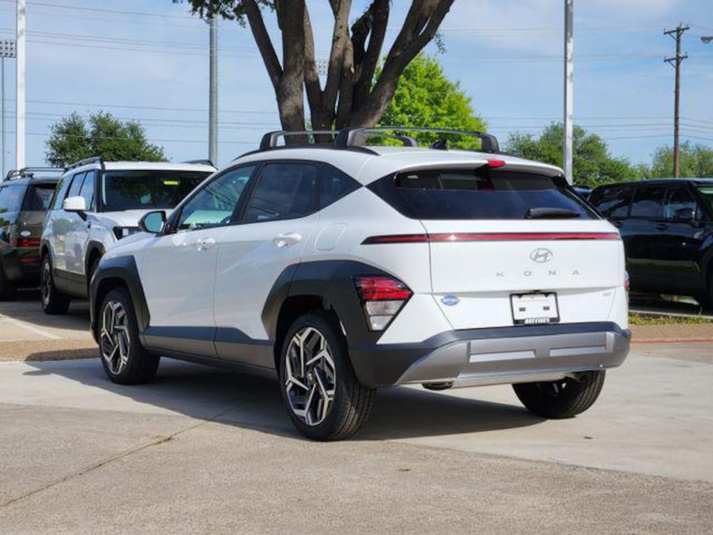 White 2026 Hyundai Kona SEL Premium 4D Sport Utility SEL Premium FWD 8-Speed Automatic I4 Option Group 01, 4-Wheel Disc Brakes, 6 Speakers, ABS brakes, Air Conditioning, Alloy wheels, AM/FM radio: SiriusXM, Apple CarPlay & Android Auto, Auto High-beam Headlights, Automatic temperature control, Brake assist, Bumpers: body-color, Carpeted Floor Mats, Cross Rails, Delay-off headlights, Driver door bin, Driver vanity mirror, Dual front impact airbags, Dual front side impact airbags, Electronic Stability Control, Emergency communication system: None, Exterior Parking Camera Rear, First Aid Kit, Front anti-roll bar, Front Bucket Seats, Front Center Armrest, Front dual zone A/C, Front reading lights, Front wheel independent suspension, Fully automatic headlights, H-Tex Seat Trim, Heated door mirrors, Heated Front Bucket Seats, Heated front seats, Illuminated entry, Leather steering wheel, Low tire pressure warning, Occupant sensing airbag, Outside temperature display, Overhead airbag, Panic alarm, Passenger door bin, Passenger vanity mirror, Power door mirrors, Power driver seat, Power steering, Power windows, Radio: AM/FM/SiriusXM/HD Audio System, Rear seat center armrest, Rear window defroster, Rear window wiper, Remote keyless entry, Security system, Speed control, Speed-sensing steering, Split folding rear seat, Spoiler, Steering wheel mounted audio controls, Tachometer, Telescoping steering wheel, Tilt steering wheel, Traction control, Trip computer, Turn signal indicator mirrors, Variably intermittent wipers, and Wheels: 19" x 7.5J Black/Silver Alloy.