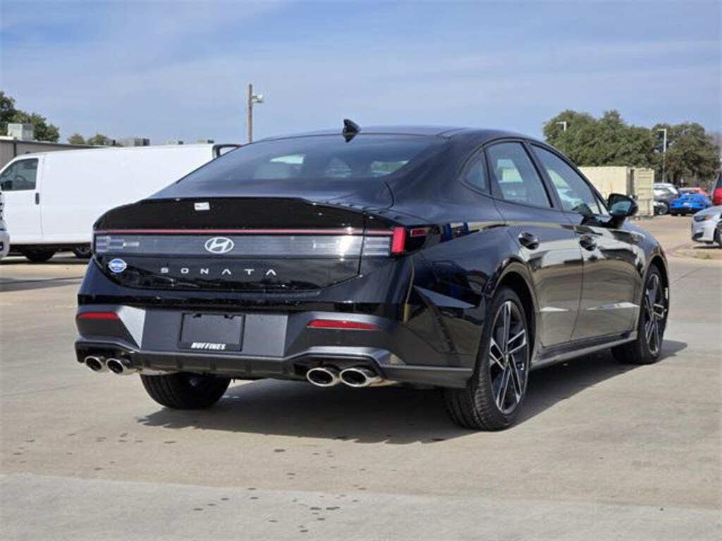 Abyss Black 2026 Hyundai Sonata N Line 4D Sedan N Line FWD 8-Speed I4 Option Group 01, 12 Speakers, 19" x 8.0J Aluminum Alloy Wheels, 4-Wheel Disc Brakes, ABS brakes, Air Conditioning, All-Season Fitted Liners, Alloy wheels, AM/FM radio: SiriusXM, Apple CarPlay & Android Auto, Auto High-beam Headlights, Auto-dimming Rear-View mirror, Automatic temperature control, Brake assist, Bumpers: body-color, Carpeted Floor Mats, Delay-off headlights, Driver door bin, Driver vanity mirror, Dual front impact airbags, Dual front side impact airbags, Electronic Stability Control, Emergency communication system: None, Exterior Parking Camera Rear, First Aid Kit, Four wheel independent suspension, Front anti-roll bar, Front Bucket Seats, Front Center Armrest, Front dual zone A/C, Front reading lights, Fully automatic headlights, Heated door mirrors, Heated front seats, Heated N Unique Sport Seats, Illuminated entry, Knee airbag, Leather steering wheel, Leatherette/Suede Combination Seating Surfaces, Low tire pressure warning, Navigation System, Occupant sensing airbag, Outside temperature display, Overhead airbag, Overhead console, Panic alarm, Passenger door bin, Passenger vanity mirror, Power door mirrors, Power driver seat, Power moonroof, Power steering, Power windows, Radio data system, Radio: AM/FM/HD/SiriusXM/MP3/Navigation, Rear anti-roll bar, Rear Bumper Applique, Rear seat center armrest, Rear side impact airbag, Rear window defroster, Remote keyless entry, Security system, Speed control, Speed-sensing steering, Speed-Sensitive Wipers, Split folding rear seat, Spoiler, Sport steering wheel, Steering wheel mounted audio controls, Tachometer, Telescoping steering wheel, Tilt steering wheel, Traction control, Trip computer, and Variably intermittent wipers.