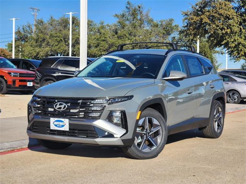 Gray 2026 Hyundai Tucson SEL Premium 4D Sport Utility SEL Premium FWD 8-Speed Automatic with SHIFTRONIC 2.5L I4 DGI DOHC 16V LEV3-SULEV30 187hp Option Group 01, 18" x 7.5J Alloy Wheels, 4-Wheel Disc Brakes, 6 Speakers, ABS brakes, Air Conditioning, Alloy wheels, AM/FM radio: SiriusXM, Apple CarPlay & Android Auto, Auto High-beam Headlights, Auto-dimming Rear-View mirror, Automatic temperature control, Brake assist, Bumpers: body-color, Cargo Cover, Cargo Net, Cargo Organizer, Cargo Tray, Carpeted Floor Mats, Delay-off headlights, Driver door bin, Driver vanity mirror, Dual front impact airbags, Dual front side impact airbags, Electronic Stability Control, Emergency communication system: Bluelink+, First Aid Kit, Four wheel independent suspension, Front anti-roll bar, Front Bucket Seats, Front Center Armrest, Front dual zone A/C, Front reading lights, Fully automatic headlights, H-Tex Leatherette Seat Trim, Heated door mirrors, Heated Front Bucket Seats, Heated front seats, Illuminated entry, Leather Shift Knob, Leather steering wheel, Low tire pressure warning, Navigation System, Occupant sensing airbag, Outside temperature display, Overhead airbag, Overhead console, Panic alarm, Passenger door bin, Passenger vanity mirror, Power door mirrors, Power driver seat, Power Liftgate, Power moonroof, Power steering, Power windows, Radio data system, Radio: AM/FM/HD Audio System, Rear anti-roll bar, Rear reading lights, Rear seat center armrest, Rear side impact airbag, Rear window defroster, Rear window wiper, Remote keyless entry, Roof Rack Cross Rails, Security system, Speed control, Split folding rear seat, Spoiler, Steering wheel mounted audio controls, Tachometer, Telescoping steering wheel, Tilt steering wheel, Traction control, Trip computer, Turn signal indicator mirrors, and Variably intermittent wipers.