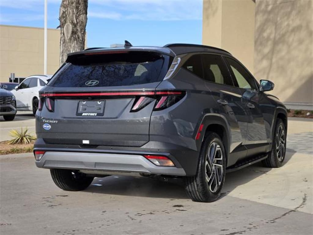 Gray 2026 Hyundai Tucson Limited 4D Sport Utility Limited FWD 8-Speed Automatic with SHIFTRONIC 2.5L I4 DGI DOHC 16V LEV3-SULEV30 187hp Option Group 01, 4-Wheel Disc Brakes, 8 Speakers, ABS brakes, Air Conditioning, Alloy wheels, AM/FM radio: SiriusXM, Apple CarPlay & Android Auto, Auto High-beam Headlights, Auto-dimming Rear-View mirror, Automatic temperature control, Brake assist, Bumpers: body-color, Cargo Net, Carpeted Floor Mats, Delay-off headlights, Driver door bin, Driver vanity mirror, Dual front impact airbags, Dual front side impact airbags, Electronic Stability Control, Emergency communication system: None, Four wheel independent suspension, Front anti-roll bar, Front Bucket Seats, Front Center Armrest, Front dual zone A/C, Front reading lights, Fully automatic headlights, Garage door transmitter: HomeLink, Heads-Up Display, Heated and Ventilated Front Bucket Seats, Heated door mirrors, Heated front seats, Heated rear seats, Heated steering wheel, Illuminated entry, Leather Shift Knob, Leather steering wheel, Leather-Trimmed Seat Trim, Low tire pressure warning, Memory seat, Navigation System, Occupant sensing airbag, Outside temperature display, Overhead airbag, Overhead console, Panic alarm, Passenger door bin, Passenger vanity mirror, Power door mirrors, Power driver seat, Power Liftgate, Power moonroof, Power passenger seat, Power steering, Power windows, Radio data system, Radio: Bose Premium w/AM/FM/HD Audio System, Rain sensing wipers, Rear anti-roll bar, Rear reading lights, Rear seat center armrest, Rear side impact airbag, Rear window defroster, Rear window wiper, Remote keyless entry, Security system, Side Steps, Speed control, Split folding rear seat, Spoiler, Steering wheel mounted audio controls, Tachometer, Telescoping steering wheel, Tilt steering wheel, Traction control, Trip computer, Turn signal indicator mirrors, Variably intermittent wipers, Ventilated front seats, and Wheels: 19" x 7.5J Alloy.