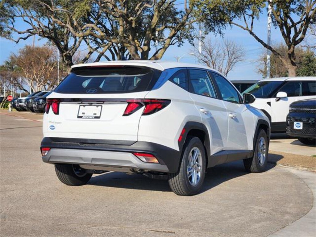 White Pearl 2026 Hyundai Tucson SE 4D Sport Utility SE FWD 8-Speed Automatic with SHIFTRONIC 2.5L I4 DGI DOHC 16V LEV3-SULEV30 187hp Option Group 01, 17" x 7.0J Alloy Wheels, 4-Wheel Disc Brakes, 6 Speakers, ABS brakes, Air Conditioning, All Season Fitted Liners, Alloy wheels, AM/FM radio: SiriusXM, Apple CarPlay & Android Auto, Auto High-beam Headlights, Brake assist, Bumpers: body-color, Cargo Net, Carpeted Floor Mats, Cloth Seat Trim, Delay-off headlights, Driver door bin, Driver vanity mirror, Dual front impact airbags, Dual front side impact airbags, Electronic Stability Control, Emergency communication system: None, First Aid Kit, Four wheel independent suspension, Front anti-roll bar, Front Bucket Seats, Front Center Armrest, Front reading lights, Fully automatic headlights, Illuminated entry, Low tire pressure warning, Occupant sensing airbag, Outside temperature display, Overhead airbag, Overhead console, Panic alarm, Passenger door bin, Passenger vanity mirror, Power door mirrors, Power steering, Power windows, Radio data system, Radio: AM/FM/HD Audio System, Rear anti-roll bar, Rear reading lights, Rear seat center armrest, Rear side impact airbag, Rear window defroster, Rear window wiper, Remote keyless entry, Security system, Speed control, Split folding rear seat, Spoiler, Steering wheel mounted audio controls, Tachometer, Telescoping steering wheel, Tilt steering wheel, Traction control, Trip computer, and Variably intermittent wipers.