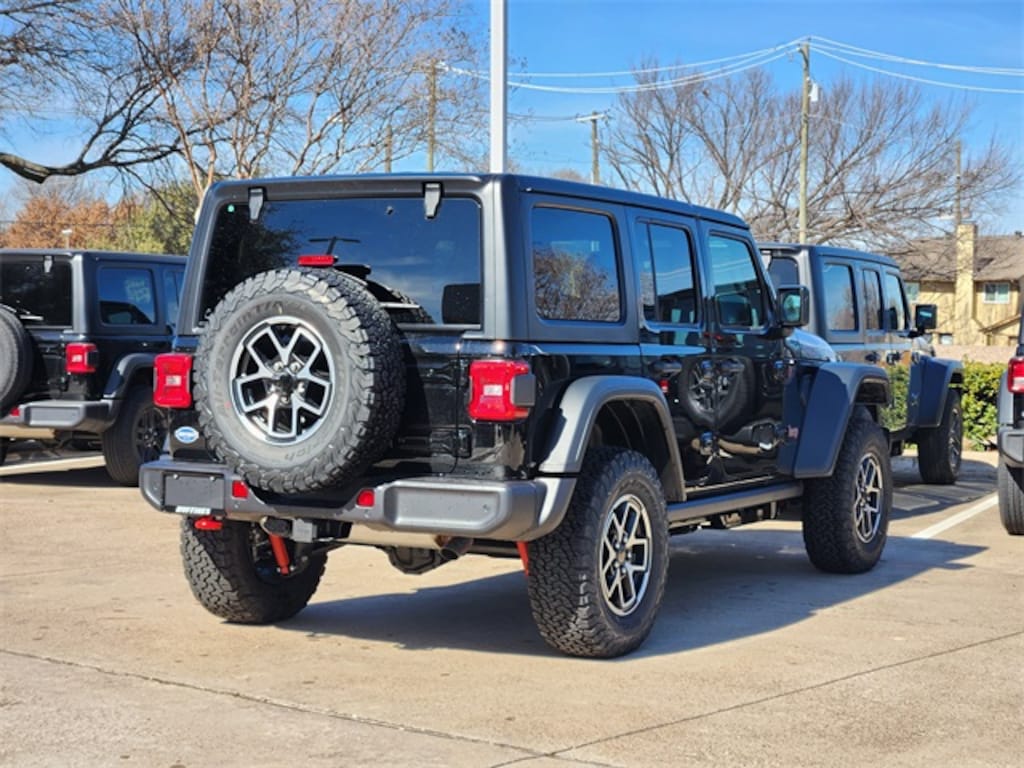 black clearcoat Rubicon 4WD 8-Speed Automatic 2.0L I4 DOHC Convenience Group (Heated Front Seats, Heated Steering Wheel, and Universal Garage Door Opener), Quick Order Package 22R Rubicon, Quick Order Package 23R Rubicon, Safety Group (Auto High Beam Headlamp Control, Blind Spot and Cross Path Detection, and ParkSense Rear Park Assist System), Steel Performance Hood Package (Performance Hood), 12.3" Touchscreen Display, 4-Wheel Disc Brakes, 4.10 Rear Axle Ratio, 4G LTE Wi-Fi Hot Spot, 8 Speakers, ABS brakes, Air Conditioning, Alloy wheels, AM/FM radio: SiriusXM with 360L, Apple CarPlay, Apple CarPlay/Android Auto, Automatic temperature control, Aux Battery, Auxiliary Switches, Black 3-Piece Hard Top, Brake assist, Class II Receiver Hitch, Cloth Low-Back Bucket Seats, Compass, Connectivity - US/Canada, Delay-off headlights, Driver door bin, Driver vanity mirror, Dual front impact airbags, Dual front side impact airbags, Electronic Stability Control, Emergency communication system: Jeep Connect, For More Info, Call 800-643-2112, Freedom Panel Storage Bag, Front anti-roll bar, Front Bucket Seats, Front Center Armrest w/Storage, Front dual zone A/C, Front fog lights, Front License Plate Bracket, Front reading lights, Fully automatic headlights, Google Android Auto, Heated door mirrors, Illuminated entry, Integrated Center Stack Radio, Integrated roll-over protection, Jeep Trail Rated Kit, Low tire pressure warning, MOPAR All-Weather Floor Mats, No Soft Top, Non-Lock Fuel Cap Without Discriminator, Occupant sensing airbag, Outside temperature display, Overhead airbag, Panic alarm, ParkView Rear Back-Up Camera, Passenger door bin, Passenger vanity mirror, Performance Suspension, Power door mirrors, Power steering, Power windows, Radio data system, Radio: Uconnect 5 with 12.3" Display, Rear anti-roll bar, Rear reading lights, Rear Window Defroster, Rear Window Wiper/Washer, Remote keyless entry, Security system, SiriusXM Radio Service, SiriusXM with 360L, Speed control, Split folding rear seat, Steering wheel mounted audio controls, Stop-Start Dual Battery System, Tachometer, Telescoping steering wheel, Tilt steering wheel, Traction control, Trip computer, Variably intermittent wipers, Voltmeter, and Wheels: 17" x 7.5" Machined/Painted Black.