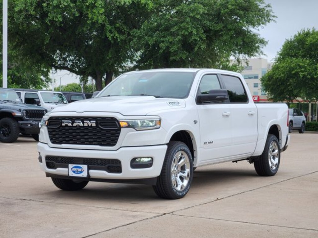 Bright White Clearcoat Big Horn/Lone Star 4WD 8-Speed Automatic HEMI 5.7L V8 Multi Displacement VVT eTorque Big Horn Level 2 Equipment Group (115V Auxiliary Power Outlet, 115V Auxiliary Rear Power Outlet, 12" Touchscreen Display, 2nd Row in Floor Storage Bins, 3 Rear Seat Head Restraints, 4 Way Front Headrests, 400W Inverter, 4G LTE Wi-Fi Hot Spot, 9 Amplified Speakers with Subwoofer, Air Conditioning ATC with Dual Zone Control, Apple CarPlay, Auto Power-Folding Mirrors, Auto-Dimming Exterior Driver Mirror, Auto-Dimming Rear-View Mirror, Black Exterior Mirrors, Black Premium Power Mirrors, Body Color Fender Flares, Bucket Seats, Center Console Parts Module, Cluster 7.0" TFT Color Display, Configurable Drive Mode, Connected Travel and Traffic Services, Connectivity - US/Canada, Convex Wide-Angle Exterior Mirror Insert, Deluxe Cloth Bucket Seats, Disassociated Touchscreen Display, Exterior Mirrors Courtesy Lamps, Exterior Mirrors with Heating Element, Exterior Mirrors with Supplemental Signals, Front Seat Back Map Pockets, Full Length Floor Console, Global Telematics Box Module, Glove Box Lamp, Google Android Auto, GPS Antenna Input, GPS Navigation, HD Radio, Heated Front Seats, Heated Steering Wheel, Integrated Center Stack Radio, Integrated Voice Command with Bluetooth, Leather Wrapped Steering Wheel, LED Dome Lamp with on/Off Switch, LED Footwell Lighting, Manual Adjust 4-Way Front Passenger Seat, Media Hub with 2 Charge Only USBs, Overhead LED Lamps, Power 2-Way Driver Lumbar Adjust, Power Adjust 8-Way Driver Seat, Power Adjustable Pedals, Premium Overhead Console, Radio: Uconnect 5 Navigation with 12.0" Display, Rear 60/40 Folding Seat, Rear Center Armrest, Rear Power Sliding Window, Rear Window Defroster, Remote Tailgate Release, Security Alarm, SiriusXM Radio Service, SiriusXM with 360L, Steering Wheel Mounted Audio Controls, Sun Visors with Illuminated Vanity Mirrors, Universal Garage Door Opener, and USB Host Flip), Quick Order Package 23R Lone Star (Lone Star Badge), Quick Order Package 27R Lone Star, Sport Appearance Package (Black Interior Accents, Body Color Door Handles, Body Color Front Bumper, Body Color Rear Bumper with Step Pads, Body Color Tailgate Handle, Grille Surround 1 Body Color Texture 1 Black, and RAM Grille Badge - Chrome), 33 Gallon Fuel Tank, 4-Wheel Disc Brakes, 48V Belt Starter Generator, 6 Speakers, ABS brakes, Air Conditioning, Alloy wheels, AM/FM radio, Apple CarPlay/Android Auto, Auto High-beam Headlights, Brake assist, Bumpers: chrome, Cloth Bucket Seats, Cluster 12" TFT Color Display, Compass, Delay-off headlights, Driver door bin, Dual front impact airbags, Dual front side impact airbags, Electronic Stability Control, Front anti-roll bar, Front Bucket Seats, Front Center Armrest w/Storage, Front fog lights, Front License Plate Bracket, Front reading lights, Front wheel independent suspension, Fully automatic headlights, Heated door mirrors, Illuminated entry, Low tire pressure warning, Manual Adjust 4-Way Driver Seat, Manual Folding Exterior Mirrors, Manufacturer's Statement of Origin, MOPAR Front and Rear Rubber Floor Mats, Occupant sensing airbag, Outside temperature display, Overhead airbag, Overhead console, Panic alarm, ParkView Rear Back-Up Camera, Passenger door bin, Passenger vanity mirror, Power door mirrors, Power steering, Power windows, Radio data system, Radio: Uconnect 5 W with 8.4" Display, Rear anti-roll bar, Rear step bumper, Remote keyless entry, Speed control, Supplier Part Tracking (J-1), Tachometer, Telescoping steering wheel, Tilt steering wheel, Traction control, Trailer Brake Control, Trip computer, Variably intermittent wipers, and Voltmeter.