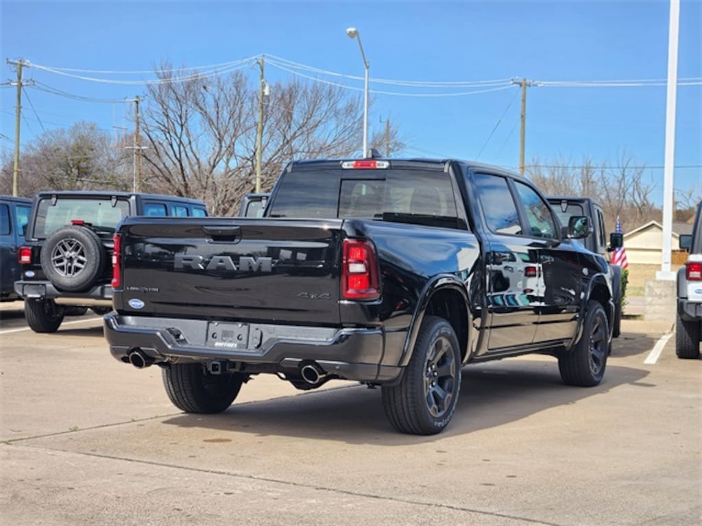 Diamond Black Crystal Pearlcoat Big Horn/Lone Star 4WD 8-Speed Automatic HEMI 5.7L V8 Multi Displacement VVT eTorque Big Horn Level 2 Equipment Group (115V Auxiliary Power Outlet, 115V Auxiliary Rear Power Outlet, 12" Touchscreen Display, 2nd Row in Floor Storage Bins, 3 Rear Seat Head Restraints, 4 Way Front Headrests, 400W Inverter, 4G LTE Wi-Fi Hot Spot, 9 Amplified Speakers with Subwoofer, Air Conditioning ATC with Dual Zone Control, Apple CarPlay, Auto Power-Folding Mirrors, Auto-Dimming Exterior Driver Mirror, Auto-Dimming Rear-View Mirror, Black Exterior Mirrors, Black Premium Power Mirrors, Body Color Fender Flares, Bucket Seats, Center Console Parts Module, Cluster 7.0" TFT Color Display, Configurable Drive Mode, Connected Travel and Traffic Services, Connectivity - US/Canada, Convex Wide-Angle Exterior Mirror Insert, Deluxe Cloth Bucket Seats, Disassociated Touchscreen Display, Exterior Mirrors Courtesy Lamps, Exterior Mirrors with Heating Element, Exterior Mirrors with Supplemental Signals, Front Seat Back Map Pockets, Full Length Floor Console, Global Telematics Box Module, Glove Box Lamp, Google Android Auto, GPS Antenna Input, GPS Navigation, HD Radio, Heated Front Seats, Heated Steering Wheel, Integrated Center Stack Radio, Integrated Voice Command with Bluetooth, Leather Wrapped Steering Wheel, LED Dome Lamp with on/Off Switch, LED Footwell Lighting, Manual Adjust 4-Way Front Passenger Seat, Media Hub with 2 Charge Only USBs, Overhead LED Lamps, Power 2-Way Driver Lumbar Adjust, Power Adjust 8-Way Driver Seat, Power Adjustable Pedals, Premium Overhead Console, Radio: Uconnect 5 Navigation with 12.0" Display, Rear 60/40 Folding Seat, Rear Center Armrest, Rear Power Sliding Window, Rear Window Defroster, Remote Tailgate Release, Security Alarm, SiriusXM Radio Service, SiriusXM with 360L, Steering Wheel Mounted Audio Controls, Sun Visors with Illuminated Vanity Mirrors, Universal Garage Door Opener, and USB Host Flip), Night Edition (Accent Color Door Handles, Accent Color Premium Power Mirrors, Accent Color Tailgate Handle, Anti-Spin Differential Rear Axle, Black Exterior Truck Badging, Black Headlamp Bezels, Black Interior Accents, Black Painted Exterior Mirrors Caps, Black Tail Lamp Bezels, Body Color Front Bumper, Body Color Rear Bumper with Step Pads, Dual Exhaust with Black Tips, Grille Black Surround Black Mesh, RAM Grille Badge - Black, and Wheels: 20" x 9.0" Aluminum Painted Clad), Quick Order Package 23R Lone Star (Lone Star Badge), Quick Order Package 27R Lone Star, 33 Gallon Fuel Tank, 4-Wheel Disc Brakes, 48V Belt Starter Generator, 6 Speakers, ABS brakes, Air Conditioning, Alloy wheels, AM/FM radio, Apple CarPlay/Android Auto, Auto High-beam Headlights, Brake assist, Bumpers: chrome, Cloth Bucket Seats, Cluster 12" TFT Color Display, Compass, Delay-off headlights, Driver door bin, Dual front impact airbags, Dual front side impact airbags, Electronic Stability Control, Front anti-roll bar, Front Bucket Seats, Front Center Armrest w/Storage, Front fog lights, Front License Plate Bracket, Front reading lights, Front wheel independent suspension, Fully automatic headlights, Heated door mirrors, Illuminated entry, Low tire pressure warning, Manual Adjust 4-Way Driver Seat, Manual Folding Exterior Mirrors, Manufacturer's Statement of Origin, MOPAR Front and Rear Rubber Floor Mats, Occupant sensing airbag, Outside temperature display, Overhead airbag, Overhead console, Panic alarm, ParkView Rear Back-Up Camera, Passenger door bin, Passenger vanity mirror, Power door mirrors, Power steering, Power windows, Radio data system, Radio: Uconnect 5 W with 8.4" Display, RAM Grille Badge - Chrome, Rear anti-roll bar, Rear step bumper, Remote keyless entry, Speed control, Supplier Part Tracking (J-1), Price includes: $1000 - 2026 Southwest BC State of Texas Regional Bonus Cash . Exp. 03/02/2026 $3500 - 2026 National Retail Consumer Cash . Exp. 03/02/2026 $750 - 2026 Southwest BC Retail Bonus Cash . Exp. 03/02/2026