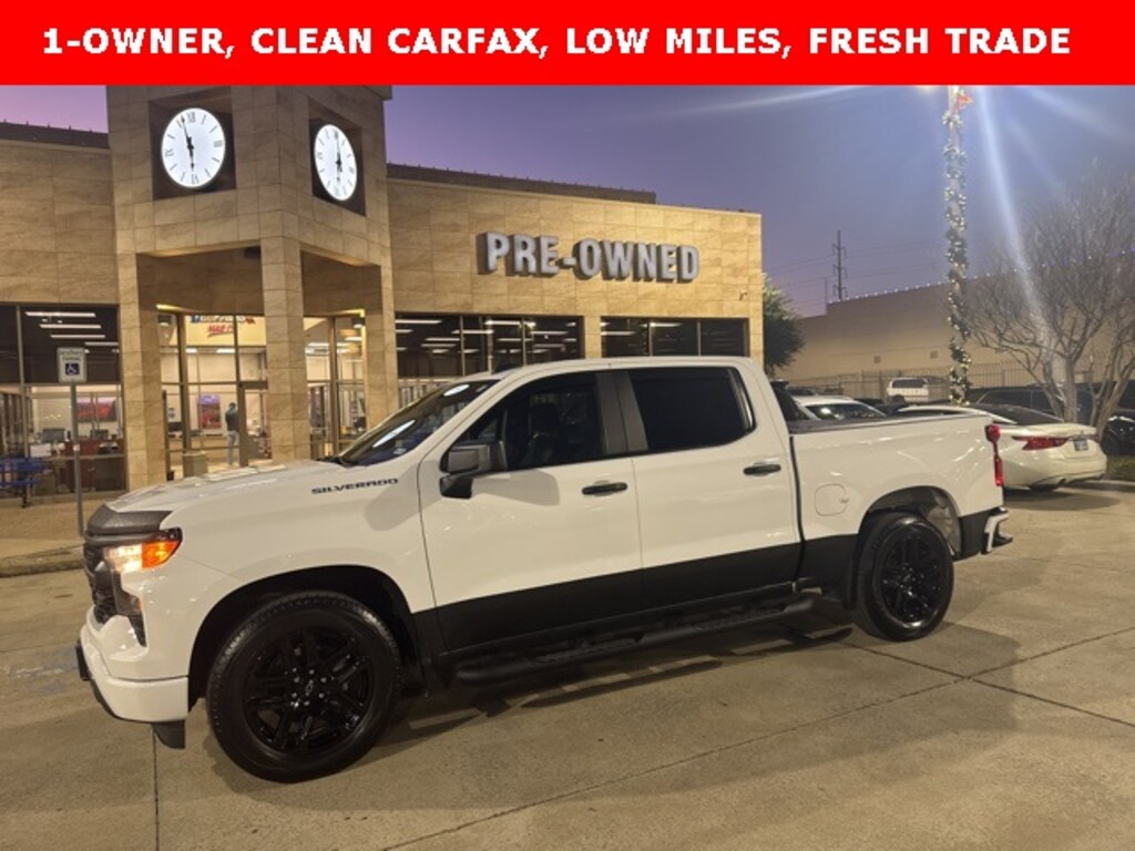 Summit White 2022 Chevrolet Silverado 1500 Custom 2.7L Turbo RWD 8-Speed Automatic **CARFAX ONE OWNER**, **CLEAN CARFAX**, **LOCAL TRADE**, **KEYLESS ENTRY**, **REMOTE START**, **REARVIEW CAMERA**, **BLUETOOTH / HANDS FREE CALLING**, **APPLE CARPLAY AND ANDROID AUTO**, 10-Way Power Driver Seat w/Lumbar, 120-Volt Bed Mounted Power Outlet, 120-Volt Instrument Panel Power Outlet, 3.5" Monochromatic Display Driver Info Center, ABS brakes, Bluetooth® For Phone, Chevrolet Connected Access Capable, Color-Keyed Carpeting Floor Covering, Compass, Custom Convenience Package, Custom Value Package, Deep-Tinted Glass, Dual Rear USB Ports (Charge Only), Electric Rear-Window Defogger, Electrical Steering Column Lock, Electronic Cruise Control, EZ Lift Power Lock & Release Tailgate, Front anti-roll bar, Front Frame-Mounted Black Recovery Hooks, Front Rubberized Vinyl Floor Mats, HD Rear Vision Camera, High Capacity Suspension Package, Hitch Guidance, LED Cargo Area Lighting, Manual Tilt Wheel Steering Column, OnStar & Chevrolet Connected Services Capable, Overhead airbag, Power Front Windows w/Driver Express Up/Down, Power Front Windows w/Passenger Express Down, Power Rear Windows w/Express Down, Preferred Equipment Group 1CX, Rear 60/40 Folding Bench Seat (Folds Up), Rear Rubberized-Vinyl Floor Mats, Remote Keyless Entry, Remote Vehicle Starter System, SiriusXM Radio, Standard Tailgate, Theft Deterrent System (Unauthorized Entry), Trailering Package, Wheels: 20" x 9" High Gloss Black Painted Alum, Wi-Fi Hot Spot Capable, Wireless Phone Projection.