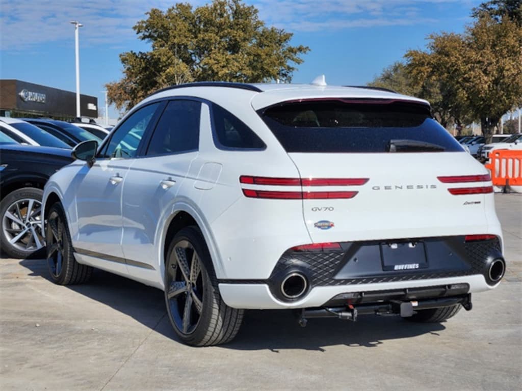 White 2025 Genesis GV70 3.5T Sport AWD 8-Speed Automatic with SHIFTRONIC 3.5L DOHC **SUNROOF**, **REMOTE START**, **RECENT OIL CHANGE**, **REAR BACKUP CAMERA**, **PUSH BUTTON START**, **NAVIGATION**, **LEATHER INTERIOR**, **LANE KEEP ASSIST**, **KEYLESS ENTRY**, **GENESIS FACTORY CERTIFIED AT NO ADDITIONAL CHARGE**, **HEATED STEERING WHEEL**, **HEATED SEATS**, **FRESH DETAIL**, **FORWARD COLLISION ALERT**, **COOLED SEATS**, **CLEAN CARFAX**, **BLUETOOTH WIRELESS PHONE CONNECTIVITY**, **BLIND SPOT DETECTION**, 4-Wheel Disc Brakes, 9 Speakers, ABS brakes, Adaptive suspension, Air Conditioning, Alloy wheels, AM/FM radio: SiriusXM, Android Auto & Apple CarPlay, Anti-whiplash front head restraints, Auto High-beam Headlights, Auto-dimming door mirrors, Auto-dimming Rear-View mirror, Automatic temperature control, Blind-Spot View Monitor, Brake assist, Bumpers: body-color, Cargo Cover, Cargo Net, Delay-off headlights, Driver door bin, Driver vanity mirror, Dual front impact airbags, Dual front side impact airbags, Electronic Stability Control, Emergency communication system: Genesis Connected Services, Exterior Parking Camera Rear, First Aid Kit, Forward/Reverse Parking Distance Warning, Four wheel independent suspension, Front anti-roll bar, Front Bucket Seats, Front Center Armrest w/Storage, Front dual zone A/C, Front reading lights, Fully automatic headlights, Garage door transmitter: HomeLink, Genesis Digital Key, Heated & Ventilated Front Bucket Seats, Heated door mirrors, Heated front seats, Heated steering wheel, Illuminated entry, Knee airbag, Layered Edge Backlit Trim, Leather Seating Surfaces w/Mesh Insert, Leather steering wheel, Leatherette Wrapped Upper Instrument Panel, Lexicon Premium Audio, Low tire pressure warning, Memory seat, Microfiber Suede Headliner, Nappa Leather Seating Surfaces w/Quilting, Navigation System, Occupant sensing airbag, Option Group 05, Outside temperature display, Overhead airbag, Overhead console, Panic alarm, Passenger door bin, Passenger vanity mirror, Power door mirrors, Power driver seat, Power Liftgate, Power moonroof, Power passenger seat, Power steering, Power windows, Radio: 14.5" Navigation System w/AM/FM/HD Radio, Rain sensing wipers, Rear anti-roll bar, Rear Parking Sensors, Rear reading lights, Rear seat center armrest, Rear window defroster, Rear window wiper, Remote keyless entry, Remote Smart Parking Assist, Reverse Parking Collision-Avoidance Assist, Reversible Cargo Tray, Security system, Speed control, Speed-sensing steering, Speed-Sensitive Wipers, Split folding rear seat, Spoiler, Sport Advanced Package, Steering wheel memory, Steering wheel mounted audio controls, Surround View Monitor, Tachometer, Telescoping steering wheel, Tow Hitch, Traction control, Trip computer, Turn signal indicator mirrors, Variably intermittent wipers, Ventilated front seats, Wheels: 19" Dark Hyper Silver Sport Alloy, Wheels: 21" Dark Sputtering Sport Alloy.