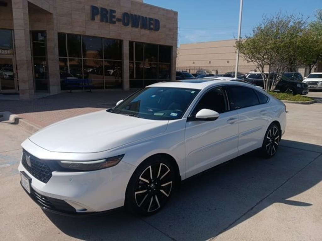 Platinum White Pearl 2023 Honda Accord Hybrid Touring 2.0L 16V DOHC FWD eCVT **CARFAX ONE OWNER**, **CLEAN CARFAX**, **LOCAL TRADE**, **NAVIGATION**, **MOONROOF**, **KEYLESS ENTRY**, **LEATHER INTERIOR**, **REARVIEW CAMERA**, **BLUETOOTH / HANDS FREE CALLING**, **VENTILATED SEATS**, **FRONT AND REAR HEATED SEATS**, **HEADS-UP DISPLAY**, **APPLE CARPLAY AND ANDROID AUTO**, ABS brakes, Adaptive Cruise Control: Adaptive Cruise Control (ACC) with Low-Speed Follow, Apple CarPlay/Android Auto, Auto-dimming Rear-View mirror, Bose Premium Sound System, Exterior Parking Camera Rear, Front anti-roll bar, Heads-Up Display, Heated & Ventilated Front Bucket Seats, Heated door mirrors, Heated front seats, Heated rear seats, Knee airbag, Lane departure: Lane Keeping Assist System (LKAS) active, Memory seat, Navigation System, Overhead airbag, Power driver seat, Power moonroof, Power passenger seat, Rear anti-roll bar, Remote keyless entry, Steering wheel mounted audio controls, Ventilated front seats, Wheels: 19" x 8.5J Berlina Black.
