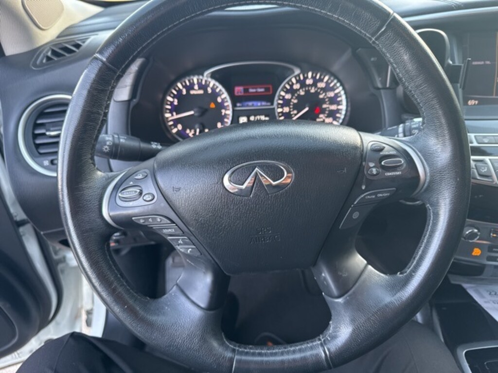 Driver Assistance Package (Active Trace Control, Auto Side Dimming Mirrors, Back-Up Collision Intervention (BCI), Blind Spot Warning System (BSW), Distance Control Assist, ECO Pedal, Front & Rear Sonar Sensors, and Intelligent Cruise Control), Premium Package (2-Way Driver's Seat Power Lumbar Support, Dual Occupant Memory System, Enhanced Intelligent Key Memory, Entry & Exit Assist, Heated Steering Wheel, Outside Mirrors w/Reverse Tilt-Down Feature, Radio: AM/FM/CD/DVD w/MP3 Playback Capability, Rear Bumper Protector, Remote Engine Start, and Roof Rails), Premium Plus Package (Around View Monitor w/Moving Object Detection, Illuminated Kick Plates (IKP), INFINITI Navigation, Rain-Sensing Front Windshield Wipers, and Voice Recognition For Navigation), Navigation System, 3rd row seats: bench, 4-Wheel Disc Brakes, 5.25 Axle Ratio, 6 Speakers, ABS brakes, Air Conditioning, Alloy wheels, AM/FM radio: SiriusXM, AM/FM/CD/MP3 Audio System, Auto-dimming Rear-View mirror, Automatic temperature control, Bodyside moldings, Brake assist, Bumpers: body-color, CD player, Delay-off headlights, Driver door bin, Driver vanity mirror, Dual front impact airbags, Dual front side impact airbags, Electronic Stability Control, Four wheel independent suspension, Front anti-roll bar, Front Bucket Seats, Front Center Armrest w/Storage, Front dual zone A/C, Front fog lights, Front reading lights, Fully automatic headlights, Garage door transmitter, Heated door mirrors, Heated Front Seats, Heated front seats, High intensity discharge headlights: Bi-Xenon, Illuminated entry, Leather Shift Knob, Leather steering wheel, Leather-Appointed Seats, Low tire pressure warning, Occupant sensing airbag, Outside temperature display, Overhead airbag, Overhead console, Panic alarm, Passenger door bin, Passenger vanity mirror, Power door mirrors, Power driver seat, Power Liftgate, Power moonroof, Power passenger seat, Power steering, Power windows, Radio data system, Rear air conditioning, Rear anti-roll bar, Rear reading lights, Rear seat center armrest, Rear window defroster, Rear window wiper, Reclining 3rd row seat, Remote keyless entry, Security system, Speed control, Speed-sensing steering, Speed-Sensitive Wipers, Splash Guards (Color-Matched Set of 4), Split folding rear seat, Spoiler, Steering wheel mounted audio controls, Tachometer, Telescoping steering wheel, Tilt steering wheel, Traction control, Trip computer, Turn signal indicator mirrors, Variably intermittent wipers, Welcome Lighting, and Wheels: 18" Triple 5-Spoke Aluminum-Alloy.