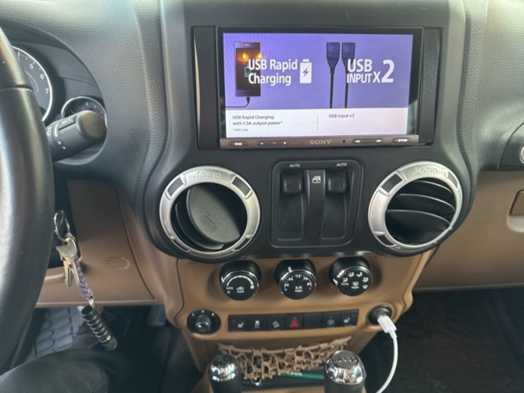 Connectivity Group (Tire Pressure Monitoring Display and Vehicle Information Center), Dual Top Group (Black 3-Piece Hard Top, Delete Sunrider Soft Top, Freedom Panel Storage Bag, Premium Black Sunrider Soft Top, Rear Window Defroster, and Rear Window Wiper/Washer), Quick Order Package 24G, Smoker's Group (Cigar Lighter and Removable Ash Tray), 1-Year SIRIUSXM Traffic Service, 1-Year SIRIUSXM Travel Link Service, 18" x 7.5" 7-Spoke Polished Aluminum Wheels, 18" x 7.5" Polished Satin Carbon Wheels, 3.21 Rear Axle Ratio, 4-Wheel Disc Brakes, 40GB Hard Drive w/20GB Available, 7 Speakers, ABS brakes, Air Conditioning, Air Conditioning w/Auto Temperature Control, Air Filtering, Alloy wheels, AM/FM radio, Audio Jack Input for Mobile Devices, Auto-dimming Rear-View mirror, Brake assist, CD player, Cloth Bucket Seats, Compass, Driver door bin, Driver vanity mirror, Dual front impact airbags, Electronic Stability Control, Engine Block Heater, Front anti-roll bar, Front Bucket Seats, Front Center Armrest w/Storage, Front fog lights, Front reading lights, Fully automatic headlights, Heated door mirrors, Heated Front Seats, Heavy Duty Suspension w/Gas Shocks, Illuminated entry, Integrated roll-over protection, Integrated Voice Command w/Bluetooth, Leather steering wheel, Low tire pressure warning, Manufacturer's Statement of Origin, MOPAR Slush Mats, Occupant sensing airbag, Outside temperature display, Panic alarm, Passenger door bin, Passenger vanity mirror, Power door mirrors, Power steering, Power windows, Radio data system, Radio: Uconnect 130 AM/FM/CD/MP3, Radio: Uconnect 730N CD/DVD/MP3/HDD/NAV, Rear anti-roll bar, Remote keyless entry, Remote Start System, Remote USB Port, Security system, SIRIUSXM Traffic, SIRIUSXM Travel Link, Speed control, Steering wheel mounted audio controls, Supplemental Front Seat Side Airbags, Tachometer, Tilt steering wheel, Traction control, Trip computer, Uconnect Voice Command w/Bluetooth, and Variably intermittent wipers.