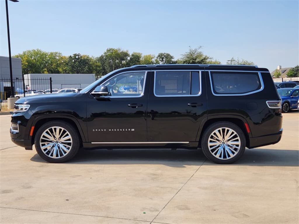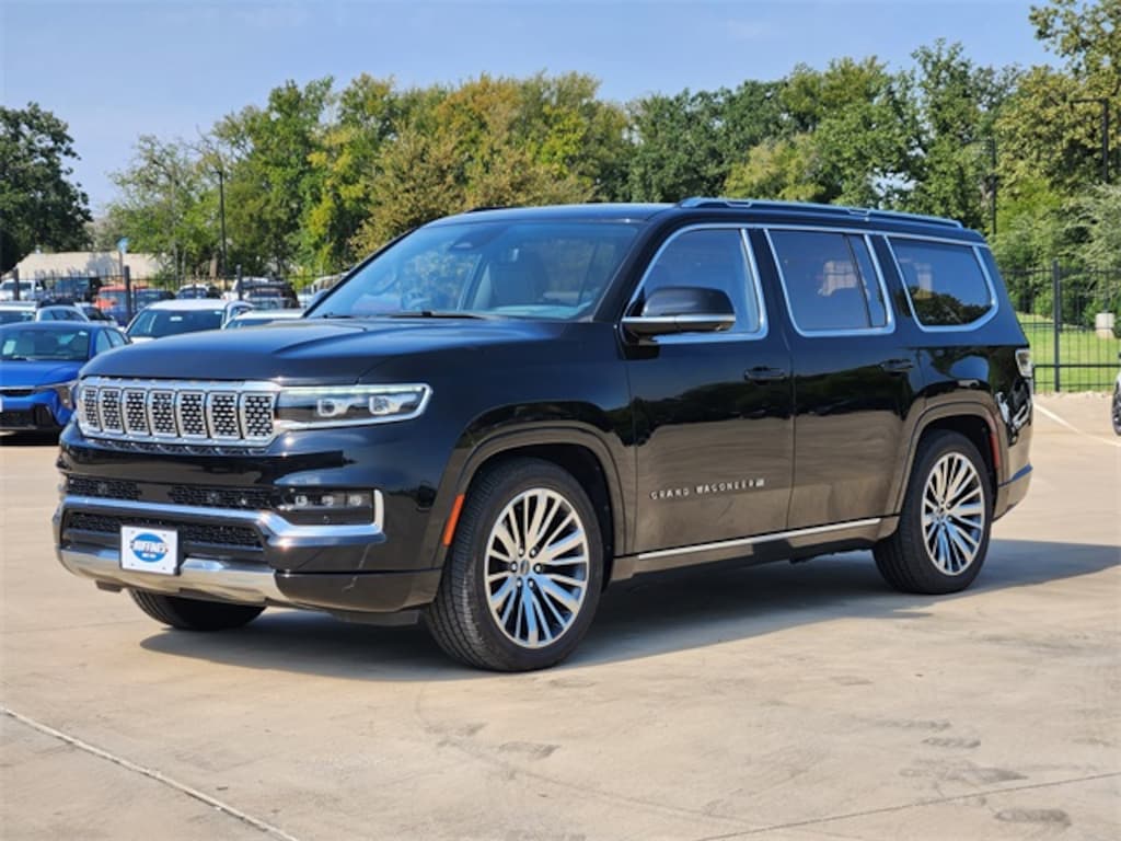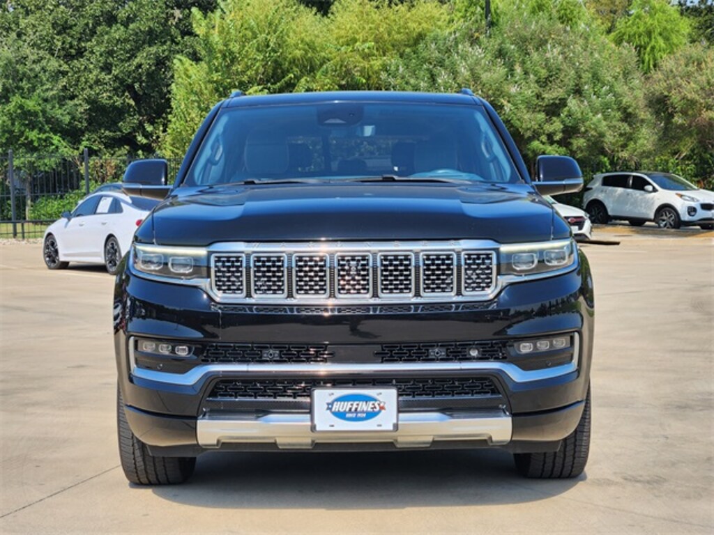 ONE OWNER, CLEAN CARFAX, 125 POINT HUFFINES CERTIFIED, REMAINDER OF FACTORY WARRANTY, BLUETOOTH, BACK UP CAMERA, 2 SETS OF KEYS, 4 WHEEL DRIVE, LEATHER SEATING, HEATED AND COOLED SEATS, PANORAMIC SUNROOF, BLIND SPOT MONITER, LANE DEPARTURE WARNING, POWER RUNNING BOARDS, APPLE CARPLAY, ANDROID AUTO, 2nd Row Dual Charge-Only USB Ports, 40/20/40 Power Recline Tip/Slide, 8-Passenger Seating, Flexible Seating Group, Navigation System, Quick Order Package 23W, Two Tone Paint Group. 2022 Jeep Grand Wagoneer Series III 6.4L V8 8-Speed Automatic 4WD Diamond Black Crystal Pearlcoat