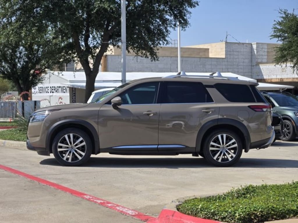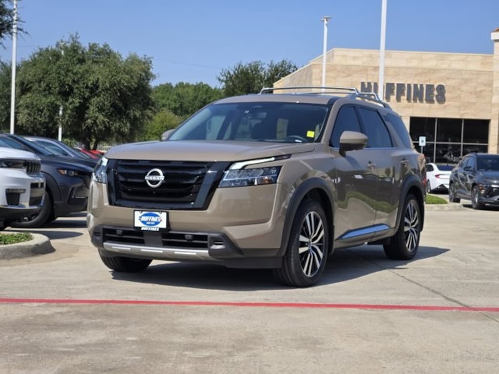 Baja Storm 2023 Nissan Pathfinder Platinum V6 4WD 9-Speed Automatic **CARFAX ONE OWNER**, **LOCAL TRADE**, **NAVIGATION**, **MOONROOF**, **KEYLESS ENTRY**, **REMOTE START**, **LEATHER INTERIOR**, **REARVIEW CAMERA**, **BLUETOOTH / HANDS FREE CALLING**, **ALL-WHEEL DRIVE**, **VENTILATED SEATS**, **HEATED SEATS**, **HEADS-UP DISPLAY**, **APPLE CARPLAY AND ANDROID AUTO**, **POWER LIFTGATE**, **LOADED!!**, 2nd-Row Captain Chairs, 2nd-Row Removable Center Console, 3rd row seats: bench, ABS brakes, AM/FM radio: SiriusXM, Auto-dimming Rear-View mirror, Exterior Parking Camera Rear, Front anti-roll bar, Garage door transmitter: HomeLink, Heads-Up Display, Heated & Cooled Front Bucket Seats, Heated front seats, Heated rear seats, Heated steering wheel, Knee airbag, Leather steering wheel, Memory seat, Navigation system: NissanConnect Navigation, Occupant sensing airbag, Platinum Captain Chairs Package, Power driver seat, Power Liftgate, Power moonroof, Power passenger seat, Rear air conditioning, Rear side impact airbag, Remote keyless entry, Security system, Semi-Aniline Leather Seating Surfaces, Steering wheel memory, Steering wheel mounted audio controls, Ventilated front seats, Wheels: 20" Machined Alloy w/Dark Met Gray Finish.