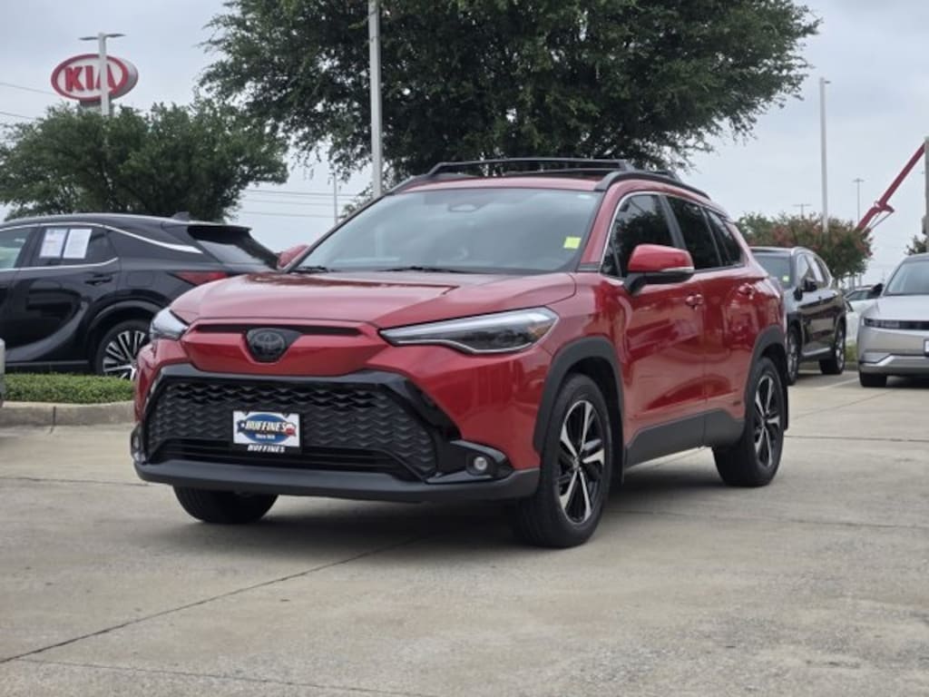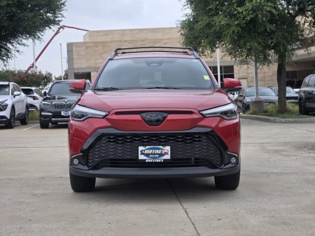 Convenience Package (PBD Auto & Easy Closer Door and Tilt & Slide Sunroof & Moonroof), Corolla Cross Hybrid XSE AWD, 4D Sport Utility, 2.0L I4 PDI Hybrid DOHC 16V LEV3-SULEV30 150hp, eCVT, AWD, Barcelona Red Metallic, Black w/SofTex Mixed Media Seat Trim, ABS brakes, Active Cruise Control, Adaptive Headlight, Auto-dimming Rear-View mirror, Exterior Parking Camera Rear, Front anti-roll bar, Front dual zone A/C, Front fog lights, Garage door transmitter: HomeLink, Heated door mirrors, Heated front seats, IMB & Alarm (Horn) Anti-Theft System, Knee airbag, Overhead airbag, Power driver seat, Radio: 8" Touch-Screen Display Audio, Radio: JBL Premium Audio w/8" Touchscreen, Rear anti-roll bar, Rear side impact airbag, Remote keyless entry, Smart USB Phone Cables (TMS), SofTex Mixed Media Seat Trim, Steering wheel mounted audio controls, Wheels: 18" Black-Painted Machined Sport Alloy, 4-Wheel Disc Brakes, 6 Speakers, Air Conditioning, Alloy wheels, AM/FM radio: SiriusXM, Auto High-beam Headlights, Automatic temperature control, Body Side Molding (TMS), Brake assist, Bumpers: body-color, Delay-off headlights, Door Sill Protectors (TMS), Driver door bin, Driver vanity mirror, Dual front impact airbags, Dual front side impact airbags, Electronic Stability Control, Emergency communication system: Safety Connect (up to 10-year trial subscription), Four wheel independent suspension, Front Bucket Seats, Front Center Armrest, Front reading lights, Fully automatic headlights, Illuminated entry, Leather steering wheel, Low tire pressure warning, Mudguards (TMS), Occupant sensing airbag, Outside temperature display, Panic alarm, Passenger door bin, Passenger vanity mirror, Power door mirrors, Power steering, Power windows, Radio data system, Rear Bumper Protector (TMS), Rear window defroster, Rear window wiper, Speed control, Split folding rear seat, Spoiler, Tachometer, TBD Axle Ratio, Telescoping steering wheel, Tilt steering wheel, Traction control, Trip computer, Turn signal indicator mirrors, and Variably intermittent wipers.